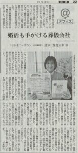本日(2月9日)朝刊の読売新聞にて「婚活も手がける葬儀会社」のお題で掲載されております。 ・葬儀経験ゼロの状態から、経営者を始めたわけ ・葬儀会社から婚活をはじめたきっかけ ・大切にしていること などを自分の体験をもとに